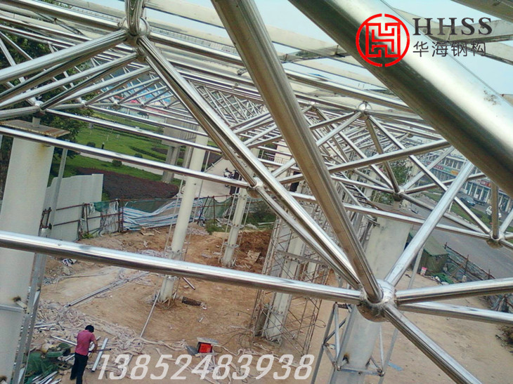 不銹鋼網(wǎng)架工程的加工與安裝:首先,不銹鋼網(wǎng)架是由多根桿件按照一定的網(wǎng)格形式通過(guò)節(jié)點(diǎn)連結(jié)而成的空間結(jié)構(gòu)。由于它空間受力、重量輕、剛度大、抗震性能好等優(yōu)點(diǎn),廣泛應(yīng)用于體育館、 影劇院、展覽廳、候車(chē)廳、體育場(chǎng)等建筑的屋蓋。不銹鋼網(wǎng)架加工廠家找江蘇華海鋼結(jié)構(gòu)有限公司,全國(guó)最大的網(wǎng)架加工基地。下面讓我們一起了解不銹鋼網(wǎng)架工程的施工安裝過(guò)程。