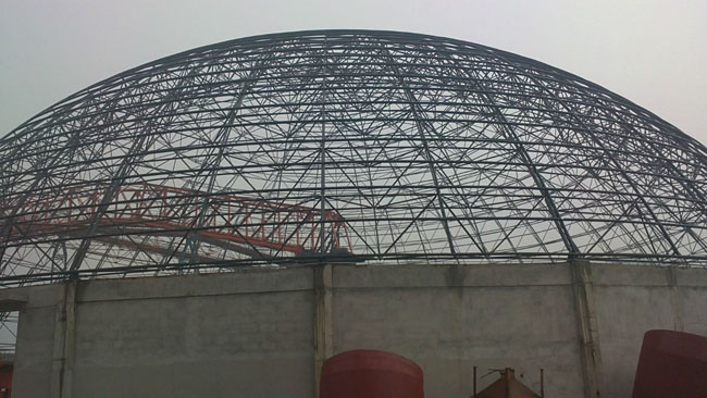 馬拉維水泥廠球形網架,水泥廠球形網架鋼網架球殼說明:江蘇華海鋼結構有限公司承建水泥廠熟料庫鋼網架球殼結構,專業球形網架設計加工廠家